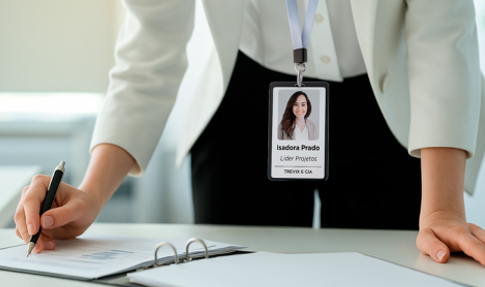 Crachás personalizados para colaboradores, produzidos no local com estúdio fotográfico ou lotes sob demanda a partir de fotos digitais enviadas pela empresa.